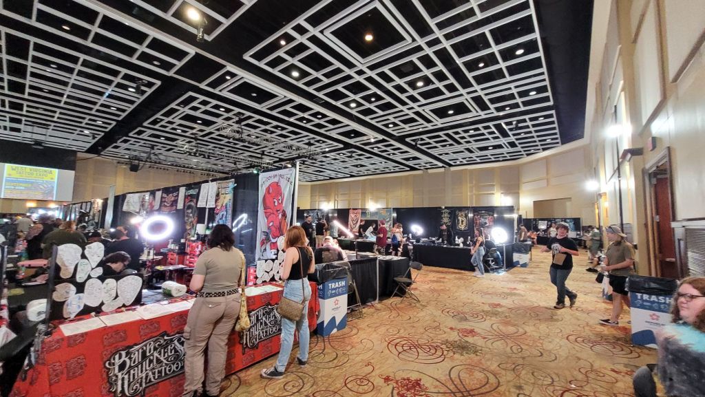 Atmosphere: I tell my friends; Ya gotta get a tattoo done at the expo! It’s not like, the typical parlor vibes. It’s HUGE! Plenty to gawk at. Prime spot for people watching. Cool vendors. Many art pieces for sale. T-Total type one fest. So much to shop and look! Art everywhere.